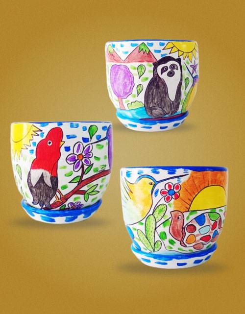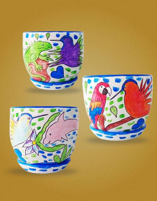 La colección está plasmada en una maceta artística de Ø 19 cm x altura 16 cm, e incluye un plato redondo de arcilla.